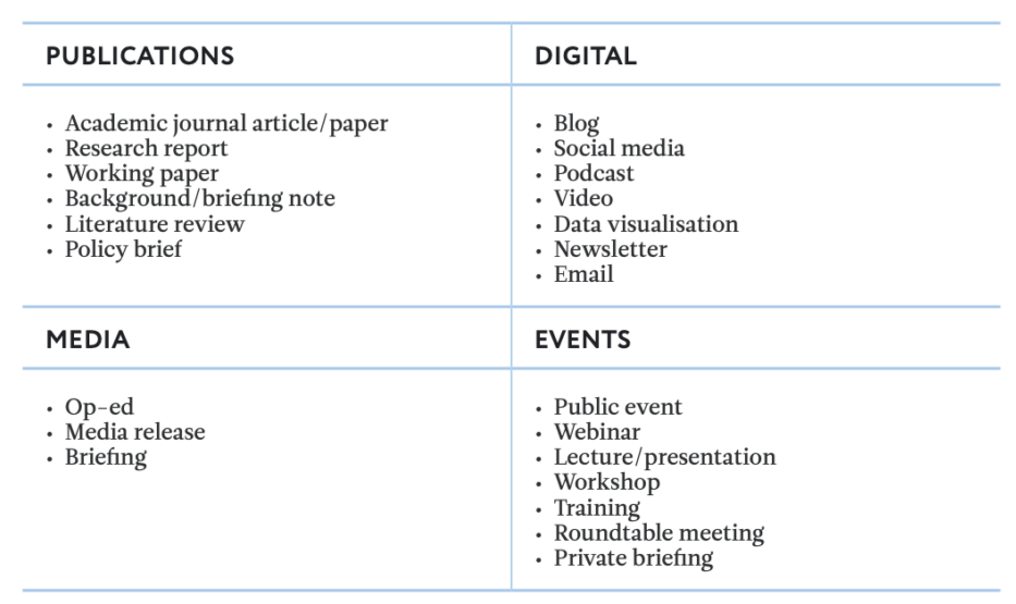 A think tank does this by developing a portfolio of communications channels and tools, and then deciding how to use them strategically. Picking the right output or channel will depend on the content (what is it you want to share) and the audience (who it is intended for).