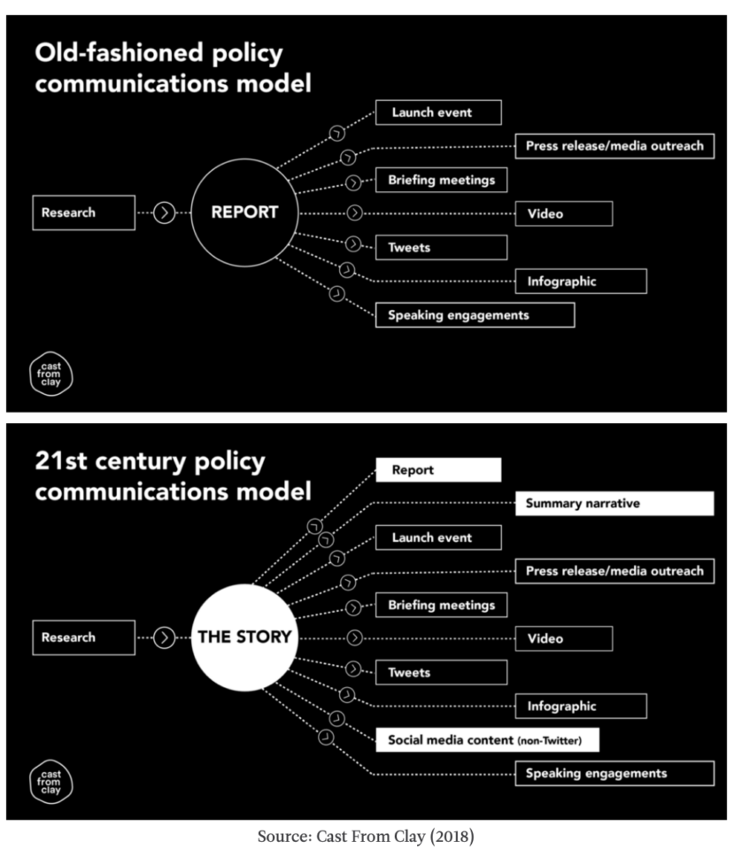 In 2018, Cast From Clay proposed a new model for policy communications. They argue that old models put the report at the centre of the think tank’s time and efforts, with key messages extracted and packaged up into other outputs to promote the report. In the new model, the report is just one of multiple assets that are used to communicate a story – the central message or narrative that you want people to hear.