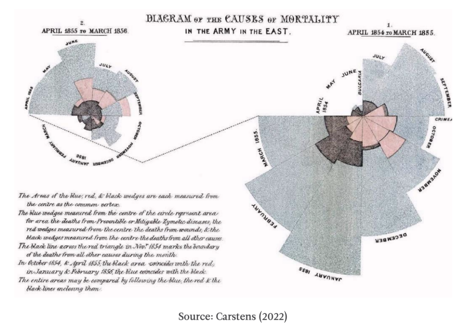 - Carstens, A. (2022). Florence Nightingale’s diagram of the causes of British military deaths during the Crimean War in Diagrammatic War, 1858.