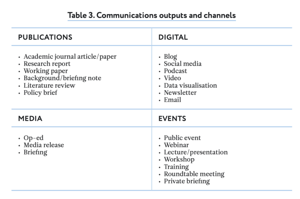 A think tank does this by developing a portfolio of communications channels and tools, and then deciding how to use them strategically. Picking the right output or channel will depend on the content (what is it you want to share) and the audience (who it is intended for).
