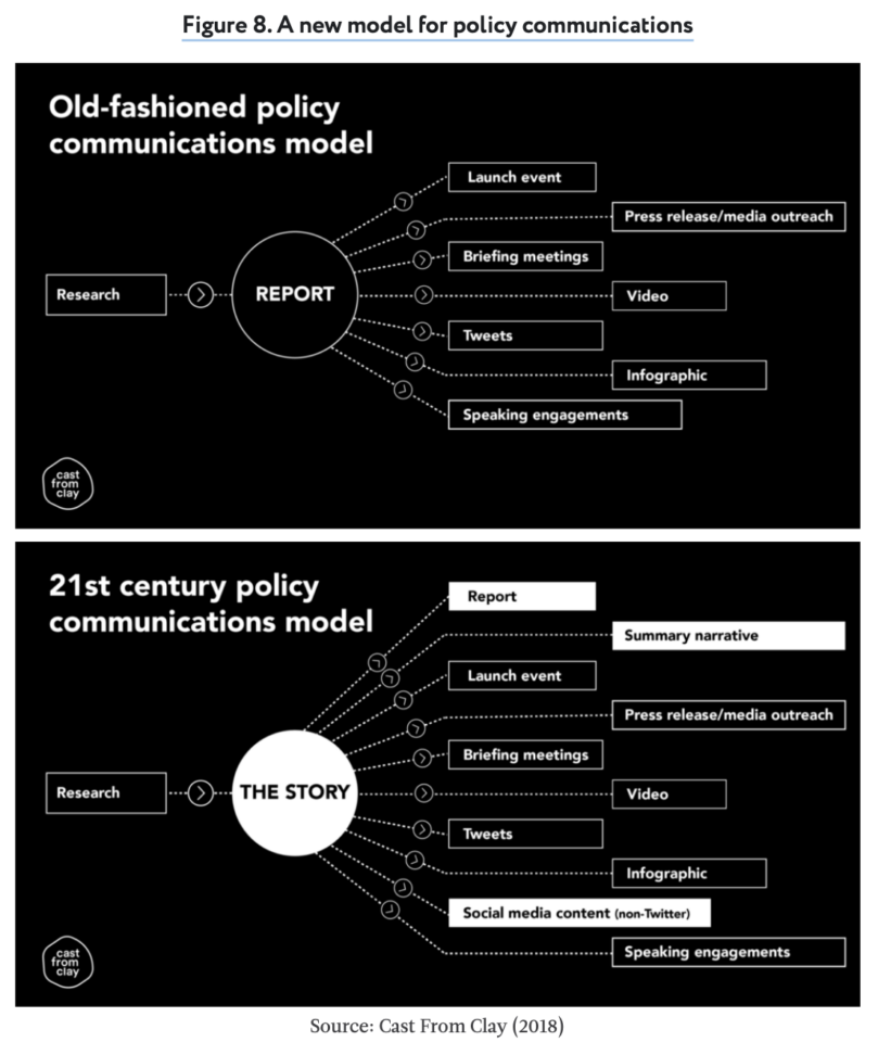 In 2018, Cast From Clay proposed a new model for policy communications. They argue that old models put the report at the centre of the think tank’s time and efforts, with key messages extracted and packaged up into other outputs to promote the report. In the new model, the report is just one of multiple assets that are used to communicate a story – the central message or narrative that you want people to hear.